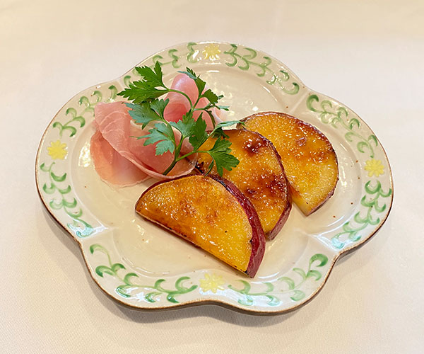 さつまいもブリュレの甘さと生ハムの塩味が絶妙な大人の一皿です。熱々のさつまいもブリュレに冷たいバニラアイスクリームを添えれば、お子様も楽しめる絶品スイーツに!